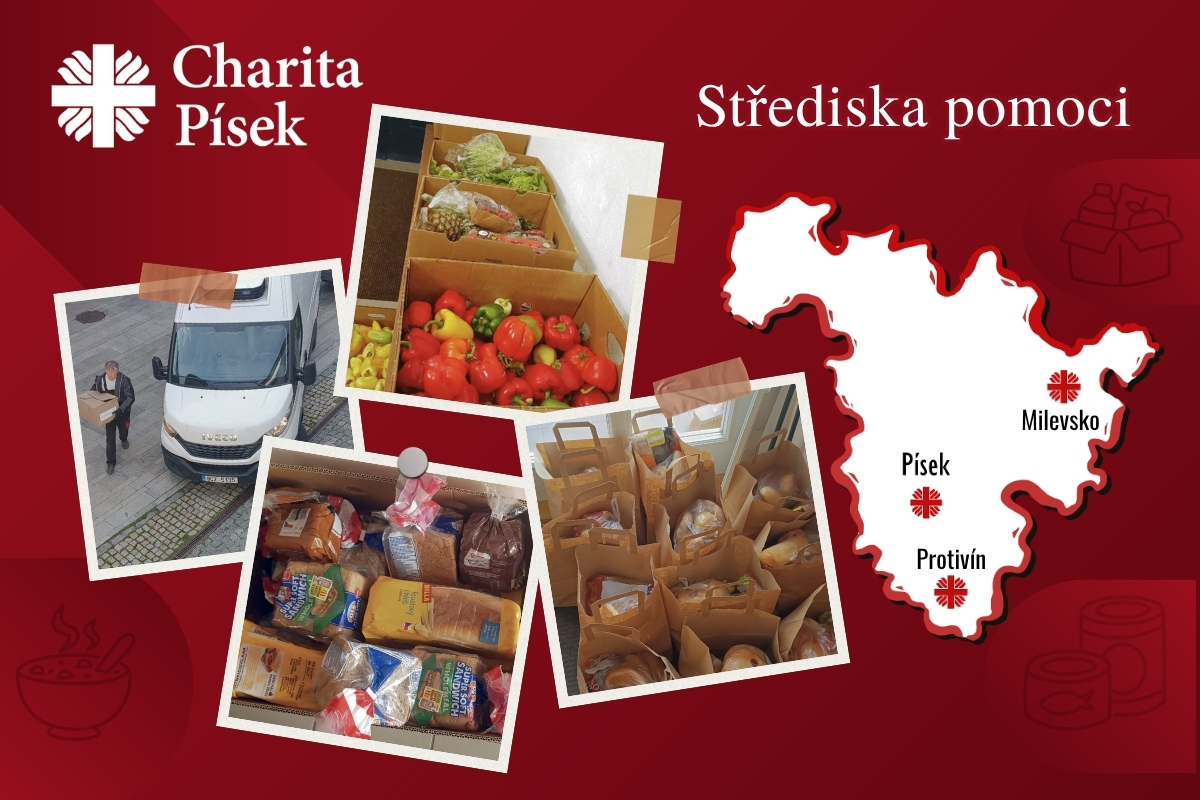 Naše dvě Střediska pomoci v Písku a Milevsku podporují samoživitelky, rodiny v těžké situaci i lidi bez domova. Součástí pomoci jsou trvanlivé i čerstvé potraviny, například pečivo, ovoce nebo zelenina, ale i drogerie.